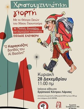 Το Εργατικό Κέντρο Λάρισας μαζί με Εργατικά Σωματεία, το Σωματείο Συνταξιούχων ΙΚΑ Ν.Λάρισας και την Ένωση Γυναικών Λάρισας (μέλος της ΟΓΕ), θα πραγματοποιήσουν για μία ακόμη χρονιά Χριστουγεννιάτικη γιορτή για τα παιδιά, την Κυριακή 28/12/2025, στις 11:00 το πρωί στην ισόγεια αίθουσα του Εργατικού Κέντρου «Τάκης Τσιόγκας».