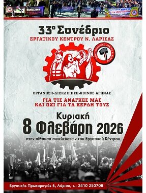 Το Εργατικό Κέντρο Λάρισας προχωρά προς το 33ο Συνέδριό του, που θα γίνει στις 8 Φλεβάρη του 2026. Μια σημαντική διαδικασία όπου οι αντιπρόσωποι που εξέλεξαν τα σωματεία, θα αποτιμήσουν την τρίχρονη δράση και τις αδυναμίες του ΕΚΝΛ από το προηγούμενο συνέδριο, θα καθορίσουν τα νέα ταξικά καθήκοντα και το διεκδικητικό πλαίσιο για το επόμενο τρίχρονο και θα εκλέξουν νέα Διοίκηση, Ε.Ε και αντιπροσώπους για τη ΓΣΕΕ.